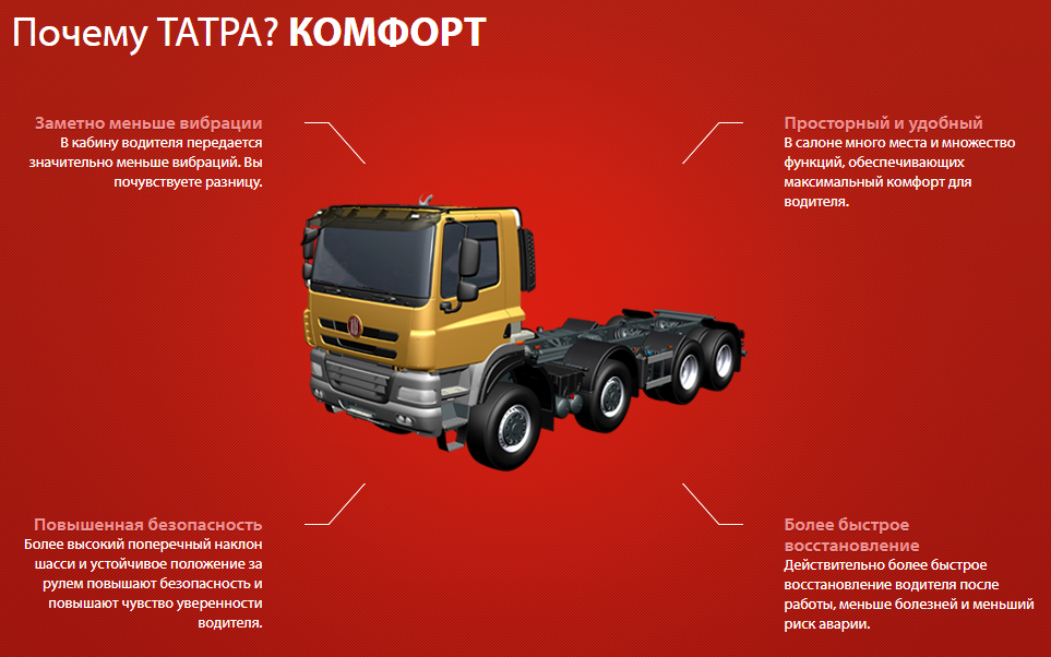 TATRA проедет туда, куда не cмогут попасть другие машины. Уникальная концепция шасси с центральной несущей трубой и независимо качающимися полуосями. Более 150 лет традиции производства, самый старый производитель автомашин в Центральной Европе, третий старейший в мире. TATRA из чешского г. Копрживнице – это легенда!